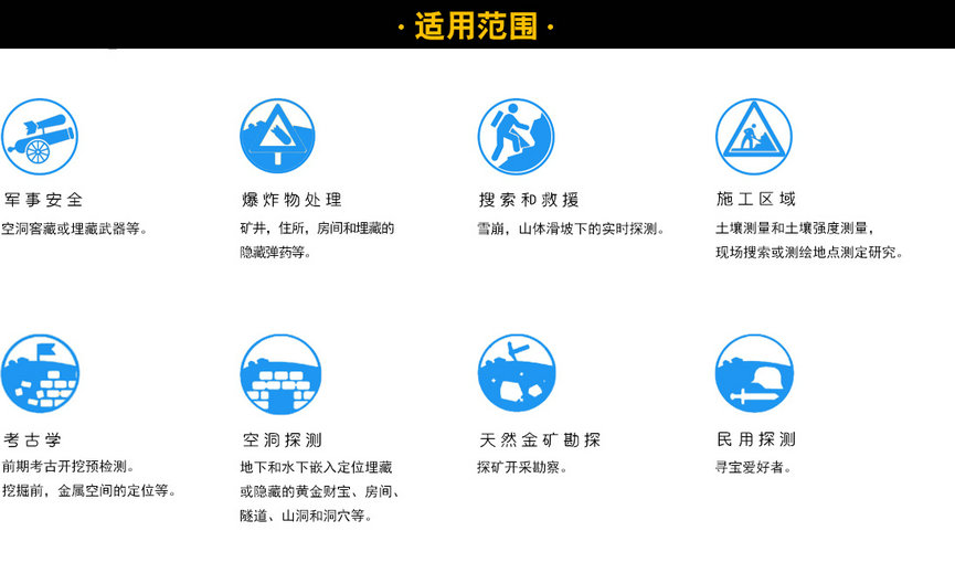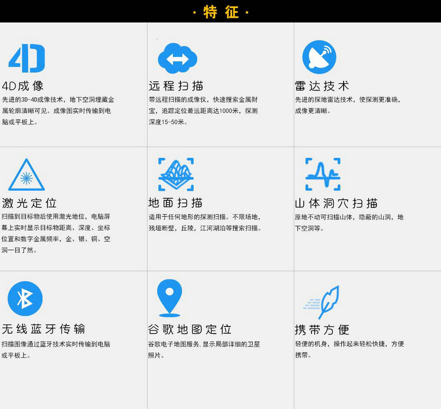 ASV質(zhì)子遠(yuǎn)程4D成像探地雷達(dá)M2(軍用版),功能強(qiáng)大,先進(jìn)的遠(yuǎn)程追蹤成像探地雷達(dá),用于地下埋藏的金屬寶藏,瓷器,珠寶,隧道,隱蔽的山洞,地下空洞的快速搜索,原地不動(dòng)掃描成像遠(yuǎn)距離1000米,掃描成像深度根據(jù)探測目標(biāo)物的不同15-50米,不限場地,殘?jiān)珨啾?,叢林樹木,丘陵山區(qū),江,河,湖泊水下金屬寶藏索搜掃描,(紅色代表金屬寶藏,藍(lán)色代表地下空洞,深蘭色六角或者菱形代表珠寶,鉆石,寶石,綠色代表土壤環(huán)境參考值)儀器電腦屏幕實(shí)時(shí)顯示物體目標(biāo)的距離,深度,電腦 軟件自帶位置坐標(biāo)定位,激光定位,屏幕左邊的數(shù)字頻率實(shí)時(shí)顯示是金,銀,銅,空洞,一目了然,操作簡單,攜帶方便,