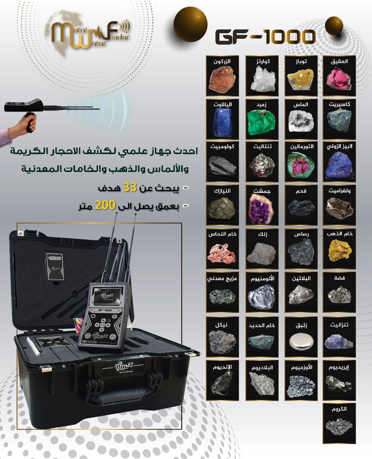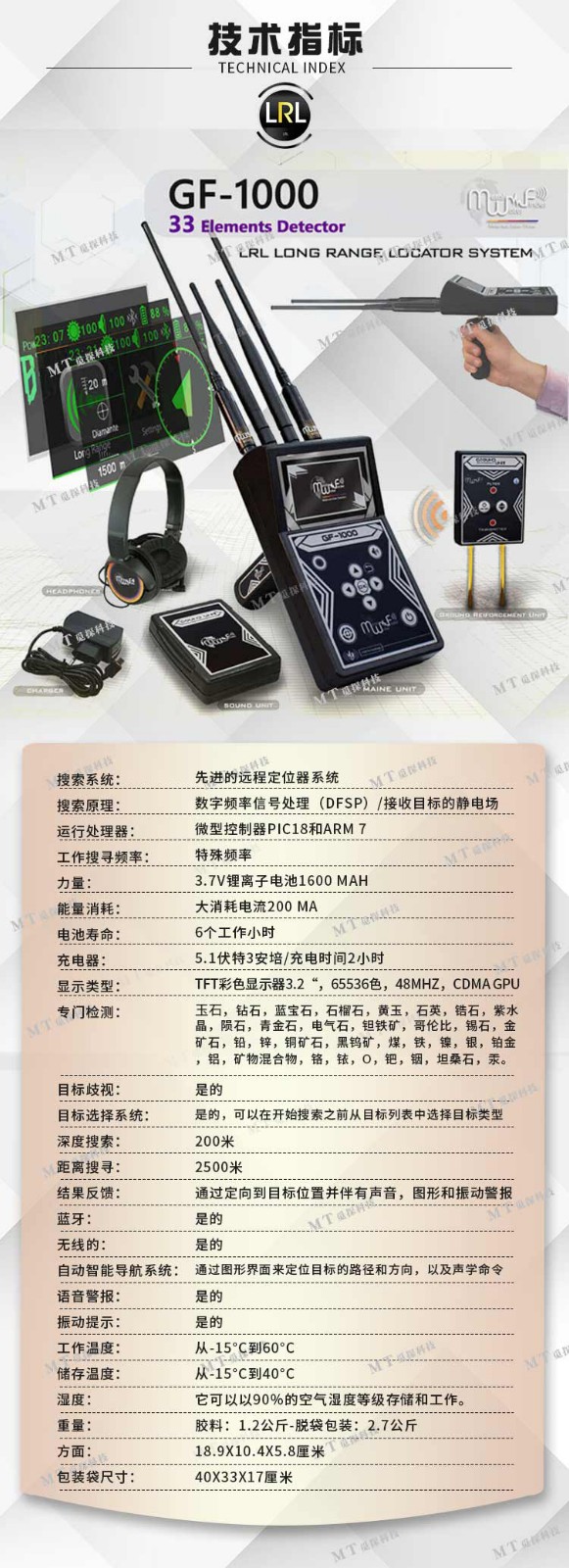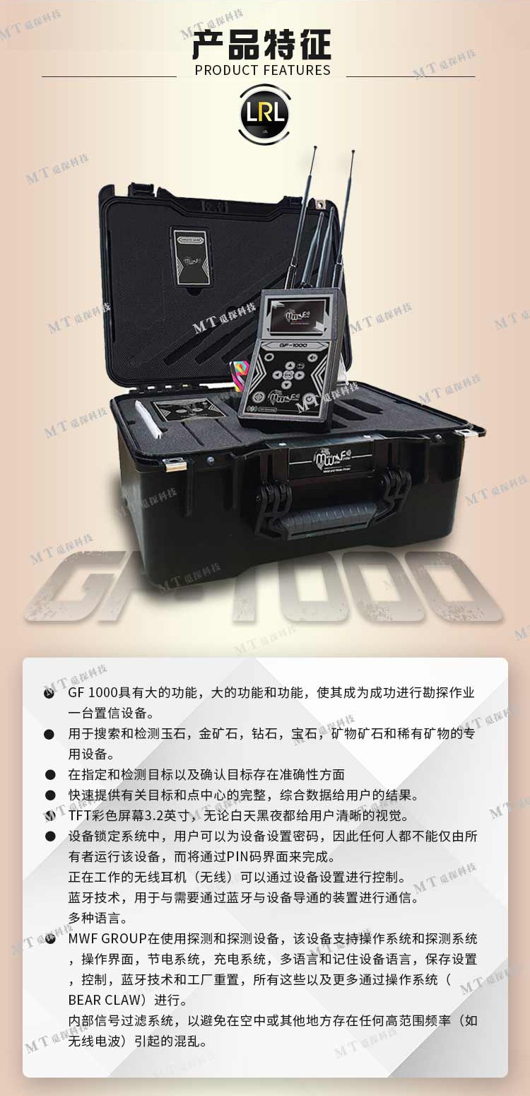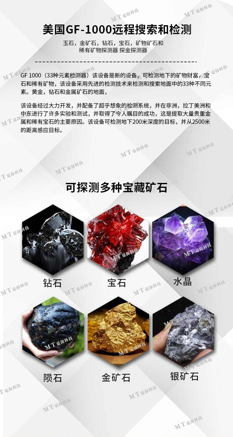 GF 1000(33種元素檢測器)該設(shè)備是新的設(shè)備,可檢測地下的礦物財富,寶石和稀有礦物,該設(shè)備采用先進(jìn)的檢測技術(shù)來檢測和搜索地面中的33種不同元素。黃金,鉆石和金屬礦石的地面,